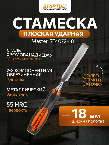 Стамеска плоская 18 мм STARTUL Master (ST4072-18) - надежный инструмент для выполнения точных и аккуратных работ по дереву. Лезвие стамески изготовлено из высококачественного материала CrV, что обеспечивает прочность и долговечность инструмента. Ширина режущей части составляет 18 мм, что позволяет выполнять широкий спектр работ. Рукоятка стамески выполнена из пластика и имеет обрезиненное покрытие, что обеспечивает удобный и надежный хват. Металлический затыльник рукоятки гарантирует прочность и долговечность инструмента. Стамеска поставляется без бруска для заточки, протектора и набора. Цвет стамески - черный, что делает ее неприметной на рабочем месте и позволяет сосредоточиться на работе. Выбирая стамеску плоскую 18 мм STARTUL Master (ST4072-18), вы получаете надежный и качественный инструмент для выполнения различных работ по дереву.
