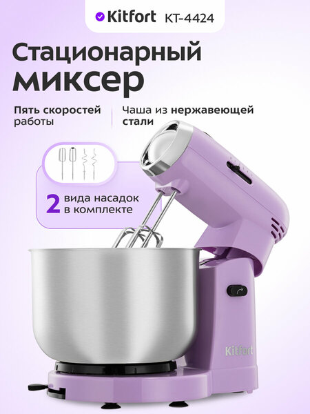 Новый мощный помощник! Стационарный миксер КТ-4424 поможет взбить яичные белки, приготовить кремы, домашние соусы, а также жидкое тесто, например для шарлотки, или густое — для сдобной выпечки. Подойдёт для любого блюда У миксера 5 скоростей работы, благодаря чему вы сможете выбрать подходящую скорость для взбивания или смешивания ингредиентов. Любое тесто мне под силу В комплекте с устройством поставляются два вида насадок: венчики подходят для взбивания ингредиентов и замешивания жидкого теста для блинов, вафель или бисквитов, а крюки — для замешивания более плотного теста, например песочного или дрожжевого. Безопасное и простое использование! Вам достаточно только установить насадки, положить ингредиенты в чашу и включить прибор. Это освободит вас от участия в процессе взбивания и перемешивания, а также позволит добавлять ингредиенты в чашу прямо в процессе смешивания. Простота использования Кнопка откидывания верхней части миксера служит для поднятия верхней части миксера и его возвращения в рабочее (горизонтальное) положение. Рычаг перемещения меняет положение подставки чаши. Вместительная чаша Миксер оснащён чашей ёмкостью 3,2 литра. Чаша изготовлена из нержавеющей стали, она прочная, и в ней можно смешивать даже горячие ингредиенты.