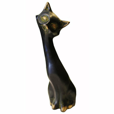 Фигурка кошки с выразительно наклонённой головой выполнена из бронзы темного оттенка. Отдельные части искусственно состарены, что создаёт эффект патины. Миндалевидные глаза, нос, ушки, лапки и хвост отполированы до золотистого цвета. На отдельных частях выполнено искусственное старение – эффект патины зеленоватого оттенка. Это очаровательная кошка — незаменимая хранительница домашнего очага, символ уюта, спокойствия, доброжелательности. Такая замечательная статуэтка несомненно украсит любой дом. Можно выбрать в пару к ней милого котика, также представленного в коллекции нашего магазина. Такая симпатичная парочка — это оригинальный подарок на новоселье или свадьбу. Размеры: длина 15см, ширина 9см, высота 27,5см. Вес 1,940 кг Сделано в Индии.