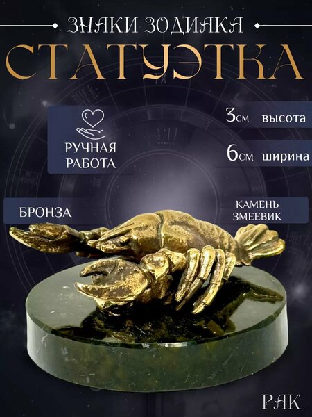 Вербица. Статуэтка «Рак» для интерьера. Фигурка для декора дома. Ручная работа. Вес 116 гр. Подставка d. 5,5 см Размеры: 3,0Х5,5 см. Материал: бронза, натуральный камень змеевик. Статуэтка "Рак" из бронзы на подставке из змеевика - идеальный выбор для тех, кто ценит уникальный и выразительный декор интерьера. Идеально впишется в интерьер вашего дома, добавляя эстетическую гармонию и уникальность. Фигурка может стать ярким элементом на полке или столе, привлекая внимание и вызывая интерес. Она может служить отличным подарком для учителя, признавая его усилия и труд, или может стать запоминающимся подарком на новоселье, добавляя уют и стиль новому дому. Стильная и красивая, эта статуэтка украсит любую комнату - будь то гостиная, спальня или даже рабочий кабинет. Не только практичная, но и эстетически привлекательная, эта статуэтка может служить декором для кухни. Или, если вы предпочитаете, она может стать декоративным элементом для рабочего стола, добавляя личный акцент вашему рабочему пространству. Наша статуэтка напоминает о скандинавском или лофт стиле и может служить домашним украшением или сувениром. Она подходит для украшения тумбочки в спальне или как интерьерная деталь для прихожей. Забавная фигурка будет отличным дополнением к коллекционным предметам или просто украшением письменного стола. Она станет замечательным подарком на день рождения для человека, родившемся под знаком зодиака “Рак”, или используйте как стильный аксессуар в офисе или ресторане. Это не просто аксессуар, это фигура, которая добавит стиль и уют в вашу жизнь, обогащая ее эстетическим удовольствием и красотой. Купить бронзовый талисман «Знаки Зодиака» ручной работы станет отличным решением, так вы сможете порадовать себя и своих близких оригинальным подарком, дарящим уют, спокойствие и только положительные эмоции.