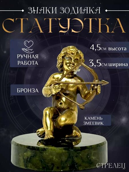 Вербица. Статуэтка «Стрелец» для интерьера. Фигурка для декора дома. Ручная работа. Вес 40 гр. Подставка d. 3,5 см Размеры: 4,5Х3,5 см. Материал: бронза, натуральный камень змеевик. Статуэтка "Стрелец" из бронзы на подставке из змеевика - идеальный выбор для тех, кто ценит уникальный и выразительный декор интерьера. Идеально впишется в интерьер вашего дома, добавляя эстетическую гармонию и уникальность. Фигурка может стать ярким элементом на полке или столе, привлекая внимание и вызывая интерес. Она может служить отличным подарком для учителя, признавая его усилия и труд, или может стать запоминающимся подарком на новоселье, добавляя уют и стиль новому дому. Стильная и красивая, эта статуэтка украсит любую комнату - будь то гостиная, спальня или даже рабочий кабинет. Не только практичная, но и эстетически привлекательная, эта статуэтка может служить декором для кухни. Или, если вы предпочитаете, она может стать декоративным элементом для рабочего стола, добавляя личный акцент вашему рабочему пространству. Наша статуэтка напоминает о скандинавском или лофт стиле и может служить домашним украшением или сувениром. Она подходит для украшения тумбочки в спальне или как интерьерная деталь для прихожей. Забавная фигурка будет отличным дополнением к коллекционным предметам или просто украшением письменного стола. Она станет замечательным подарком на день рождения для человека, родившемся под знаком зодиака “Стрелец”, или используйте как стильный аксессуар в офисе или ресторане. Это не просто аксессуар, это фигура, которая добавит стиль и уют в вашу жизнь, обогащая ее эстетическим удовольствием и красотой. Купить бронзовый талисман «Знаки Зодиака» ручной работы станет отличным решением, так вы сможете порадовать себя и своих близких оригинальным подарком, дарящим уют, спокойствие и только положительные эмоции.