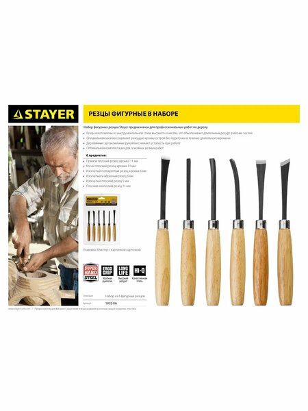 Набор фигурных резцов Stayer предназначен для профессионалов, работающих по деревуПреимуществаРезцы изготовлены из инструментальной стали высокого качества, что обеспечивает долгий ресурс заостренной его части. Деревянные эргономичные рукоятки снижают усталость при работеИспользованиеРезцы предназначены для фигурного вырезания или вытачивания различных вещей из дерева, пластика Гарантия: 12 месяцев, не распространяется на естественный износ инструмента Количество предметов, шт: 6 Длина жала, мм: 165 Материал рукояток: дерево Материал резцов: инструментальная сталь