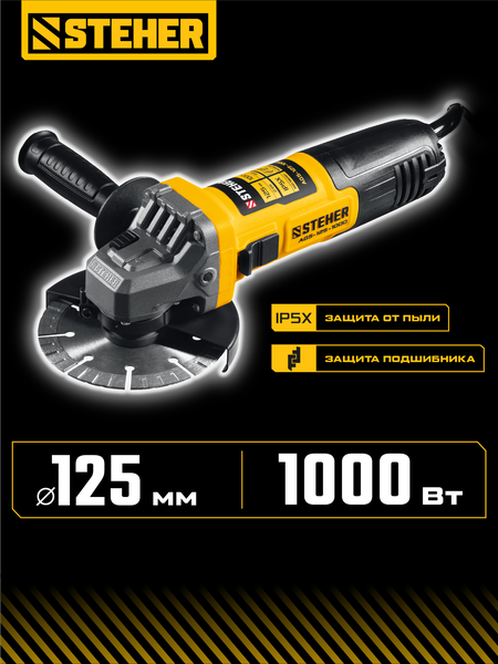 Угловая шлифмашина STEHER AGS-125-1000, предназначена для использования в качестве отрезной, дисковой шлифовальной, шлифовальной и зачистной машины при установке соответствующего расходного инструмента. Компактная модель, особенно удобная для работы в труднодоступных местах. Собственный эргономичный дизайн, компактный корпус и малый вес делают работу неутомительной и удобной. Изделие имеет защиту от пыли, что увеличивает срок службы. Преимущества Удобный, компактный инструмент с увеличенной мощностью двигателя. Легкая и удобная машина с тонким корпусом для хвата одной рукой. Пылезащищенный выключатель (степень защиты IP5X) - надежная защита основного узла. Возможность установки дополнительной рукоятки в трех положениях. Удобная блокировка шпинделя для быстрой замены диска. Фланцы из разного материала предотвращают чрезмерное затягивание диска при работе. Корпус редуктора из алюминиевого сплава лучше отводит тепло. Специальная конструкция щеткодержателя, предотвращающая повреждение коллектора при полном износе щеток. Поворотная с шагом 90° голова позволяет настроить изделие под левую руку или для резки. Тонкий и эргономичный корпус позволяет удобно удерживать инструмент во время работы, не утомляясь. Легкое включение удобной кнопкой в одно движение. Простой доступ к щеткам для замены.
