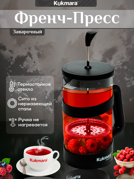 Стеклянный чайник Kukmara French Press, 1 л Френч-пресс — ваш идеальный помощник для ароматного кофе и чая. Элегантный и удобный в использовании, френч-пресс позволяет сохранить естественный вкус и насыщенность напитка без лишних усилий. Благодаря простому, но эффективному механизму, вы сможете за считанные минуты приготовить любимый кофе, травяной или классический чай, а также фруктовые настои. Корпус из прочных и безопасных материалов гарантирует долговечность и легкость ухода. Прозрачные стенки позволяют наблюдать за процессом заваривания, создавая особую атмосферу утреннего ритуала или уютного чаепития. Эргономичная ручка обеспечивает удобство в использовании, а надёжный поршень с фильтром эффективно отделяет гущу или чайные листья от готового напитка. Френч-пресс — это классика, проверенная временем, для тех, кто ценит натуральный вкус, простоту приготовления и эстетику в каждой детали. Незаменим как дома, так и в офисе.