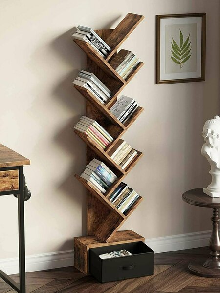 【Идеально вписывается в ваш интерьер】 Рустические полки в форме дерева — классика с ноткой винтажности. Их функциональный дизайн отлично подходит для демонстрации книг, журналов, украшений, романов, колонок и т. д. 【Экономия места и большой объем】 Размеры книжной полки в форме дерева: 21 г × 38 ш × 148 в см. Полка компактна, но оснащена 8 открытыми полками и 1 нижним ящиком (21 × 38 × 18 см), обеспечивая достаточное хранилище. 【Качественные материалы и прочный дизайн】 Книжная полка в форме дерева не только гарантирует высокую стабильность и долговечность, но и предоставляет вам безопасное, здоровое и просторное хранилище в спальне или другом помещении дома. 【Сборка за 15 минут и легкая уборка】 В комплект входят четкие и подробные инструкции, пронумерованные детали sowie шестигранный ключ L-образной формы для сборки. Полки легко очищаются влажной тряпкой. 【Широкий диапазон применения】 Деревянная книжная полка подходит для любого помещения, где нужна книжная полка или полка для демонстрации предметов. Это прекрасный мебельный предмет, сочетающий элегантность, простоту и практичность. Склад с полками — деревянный ный шкаф-деревовидный knihный стеллаж для книг