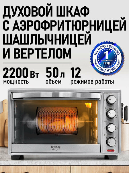 Макс. мощность 2200Вт, 50л, Конвекция, Подсветка камеры, мех. упр, 4 нагр. эл-в, 12 режимов работы, Темп 100-250°С, Таймер 60 мин, Звук сигн, Акс: Аэрофритюрница, шашлычница, вертел, противень, решетка, поддон для крошек, ручка для противня и решетки. Данная модель оснащена: • Камерой объемом 50 литров и подсветкой; • 12 предустановленными режимами работы (в том числе: конвекцией и автоматическим вращением вертела); • Широким набором аксессуаров: вертел, противень, решетка, ручка для извлечения противня/решетки, поддон для крошек, аэрофритюрница, ручка для вертела, шашлычница. • Таймером со звуковым сигналом. Всё это сделает процесс приготовления горячей пищи удобным и быстрым! • Мощные нагревательные элементы в совокупности с режимом конвекции особенно быстро прогревают камеру, поэтому электрический духовой шкаф поможет Вам приготовить самые вкусные горячие блюда, домашнюю выпечку с румяной корочкой и бесчисленное множество разнообразных кулинарных шедевров без потери времени. • Режим конвекции избавляет от необходимости перемещения блюда и противня во время приготовления, так как обеспечивает постоянную циркуляцию горячего воздуха по всей внутренней камере, за счет чего достигается одинаковая температура нагрева блюда со всех сторон, что позволяет пище запекаться и покрываться румяной корочкой равномерно по всей поверхности. • Вертел расширяет кулинарные возможности ещё больше. Будет удобно готовить курицу гриль с хрустящей корочкой, а также бесконечно экспериментировать и пробовать новые вкусы. • Надёжные компоненты прибора обеспечат длительный срок службы и бесперебойную работу. • Электрический духовой шкаф Stingray – Ваш отличный помощник на кухне, используя который станет просто и приятно радовать себя и своих близких вкусными горячими блюдами! Мини печь с вертелом, духовка с конвекцией, настольная электродуховка, шашлычница, аэрофритюрница