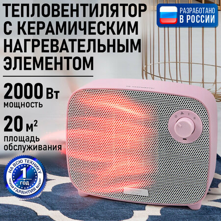 Тепловентилятор керамический, конвектор, макс. мощность: 2000 Ватт, керамический нагр. элемент, 3 режима: горячий, теплый и воздух комнатной температуры, 2 режима мощности обогрева, автоматическое отключение при перегреве, световой индикатор работы, корпус изготовлен из термостойкого пластика. Один из самых востребованных приборов зимой и в межсезонье. Он компактен, мобилен и быстрее других бытовых обогревателей доводит температуру внутри помещения до комфортной. Технология принудительного конвекционного нагрева за счет вращения вентилятора обладает максимальной теплоотдачей и энергоэффективностью, по сравнению с обогревателями других типов. Оснащен высокоэффективным керамическим нагревательным элементом высокой мощности. Благодаря этому прибор мгновенно выходит на рабочую температуру и быстро обогревает помещение. Керамический нагревательный элемент нового поколения создан из природного натурального материала, не выделяет вредных примесей при нагревании, не имеет запаха и очень быстро достигает рабочей температуры, при этом не выжигая кислород, сохраняя влажность воздуха оптимальной. Отличается пониженный уровнем шума в процессе работы, что делает его использование максимально комфортным. В зависимости от целей и размера помещения доступно 3 режима работы: 2 режима мощности обогрева и воздух комнатной температуры. Автоматическое отключение при перегреве обеспечивает полную пожарную безопасность обогревателя. Бытовая техника для дома обогреватели и вентиляторы удобный гаджет для дома.
