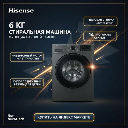 Стиральная машина Hisense 6 кг — надежная и удобная модель для всей семьи. Оборудована 15 программами, стерилизацией при 95°, функцией пара и глубокой очисткой барабана, что обеспечивает высокий уровень гигиены. Специальная программа для детской одежды бережно ухаживает за тканью и устраняет аллергены благодаря высокотемпературной стерилизации. Очистка барабана поддерживает идеальную чистоту внутри машины: увеличенный объем воды, высокая температура и высокая скорость вращения удаляют загрязнения и запахи. Инверторный двигатель снижает уровень шума (58 дБ), обеспечивает надежность и экономит электроэнергию. Отжим 1200 об/мин эффективно удаляет влагу и подготавливает одежду к быстрому высыханию. Преимущества: