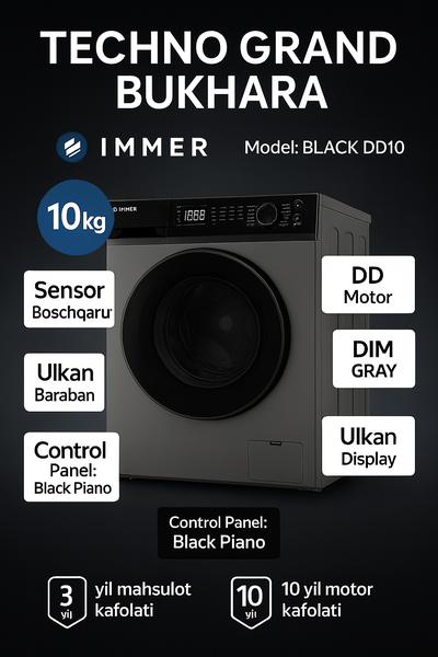 {"widgets":{"@card/UniversalPromoBadge":{"/content/page/fancyPage/defaultPage/universalPromoBadge":{"wrapperProps":{"margins":{"bottom":"3"}},"initialTime":1771274450989,"offerComposeId":"7379786547590750168"}}},"meta":{"/content/page/fancyPage/defaultPage/universalPromoBadge":{"name":"@card/UniversalPromoBadge"}},"collections":{"productServiceSnippets":{"7379786547590750168":{"productSnippet":{"snippetId":"document_id","type":"MODEL_CARD_LAYOUT","productPayload":{"snippetStyle":"NORMAL","title":{"value":"IMMER 10 kg Black 10DD – Большой барабан, быстрый отжим, экономичная стирка, сенсорное управление"},"badges":{},"price":{"actualPrice":{"amount":{"intPart":4300000,"currency":"UZS"},"style":"RED","type":"OTHER_DISCOUNT"},"oldPrice":{"amount":{"intPart":5999900,"currency":"UZS"},"style":"STRIKETHROWED"}},"gallery":{"mediaItems":[{"picture":{"baseUrl":"https://avatars.mds.yandex.net/get-mpic/12301852/2a0000019ab6000122bdfb73a00cf9db74f2/","width":1024,"height":1536,"title":"IMMER 10 kg Black 10DD – Большой барабан, быстрый отжим, экономичная стирка, сенсорное управление"},"type":"IMAGE"},{"picture":{"baseUrl":"https://avatars.mds.yandex.net/get-mpic/16390348/2a0000019ab291ee9f3b9c626d2789c93aeb/","width":1024,"height":1536,"title":"IMMER 10 kg Black 10DD – Большой барабан, быстрый отжим, экономичная стирка, сенсорное управление"},"type":"IMAGE"},{"picture":{"baseUrl":"https://avatars.mds.yandex.net/get-mpic/16164715/2a0000019a7d8b763995668a55dd455ecb06/","width":700,"height":700,"title":"IMMER 10 kg Black 10DD – Большой барабан, быстрый отжим, экономичная стирка, сенсорное управление"},"type":"IMAGE"},{"picture":{"baseUrl":"https://avatars.mds.yandex.net/get-mpic/15549911/2a0000019ab60001225b13c52a17625e4cbd/","width":1024,"height":1024,"title":"IMMER 10 kg Black 10DD – Большой барабан, быстрый отжим, экономичная стирка, сенсорное управление"},"type":"IMAGE"},{"picture":{"baseUrl":"https://avatars.mds.yandex.net/get-mpic/16285991/2a0000019a7d8b7634162c86a8c5f3461d37/","width":548,"height":700,"title":"IMMER 10 kg Black 10DD – Большой барабан, быстрый отжим, экономичная стирка, сенсорное управление"},"type":"IMAGE"},{"picture":{"baseUrl":"https://avatars.mds.yandex.net/get-mpic/11318716/2a0000019a7d8b7634684d00cff0cb6c7145/","width":559,"height":700,"title":"IMMER 10 kg Black 10DD – Большой барабан, быстрый отжим, экономичная стирка, сенсорное управление"},"type":"IMAGE"},{"video":{"url":"https://runtime.strm.yandex.ru/player/video/vplvvmfjbr37nako55kn","width":1920,"height":1080,"title":"IMMER 10 kg Black 10DD – Большой барабан, быстрый отжим, экономичная стирка, сенсорное управление","preview":{"baseUrl":"https://avatars.mds.yandex.net/get-mpic/5220508/2a0000019ab6000fa8c089913d6676f5c0ee/","width":1920,"height":1080,"title":"IMMER 10 kg Black 10DD – Большой барабан, быстрый отжим, экономичная стирка, сенсорное управление"},"streams":[{"type":"dash","url":"https://strm.yandex.ru/vod/vh-market-upload-converted/vod-content/vplvvmfjbr37nako55kn/c43994f3-2c90-4d6d-a909-da71c017ad84/kaltura/desc_9dba9907447dc4db0494e48d3f712013/x/ysign1=b147cdb185e0df320e9cab6b0b8da3176c8ab80c2132313284d32894296e8671,abcID=56084,chID=vplcw5a4be2almmy7knw,pfx,sfx,ts=699623d2,video=vplvvmfjbr37nako55kn/manifest.mpd?packager=1&packman=1"},{"type":"hls","url":"https://strm.yandex.ru/vod/vh-market-upload-converted/vod-content/vplvvmfjbr37nako55kn/c43994f3-2c90-4d6d-a909-da71c017ad84/kaltura/desc_9dba9907447dc4db0494e48d3f712013/x/ysign1=4a140ce7503eaf3b7dc938edd74fb22ff39f8f4f0ab7dc14fdd8009d43546d31,abcID=56084,chID=vplcw5a4be2almmy7knw,pfx,sfx,ts=699623d2,video=vplvvmfjbr37nako55kn/master.m3u8?packager=1&packman=1"}]},"type":"VIDEO"}]},"rating":{"ratingValue":4.3,"ratingCount":4,"reviewsCount":1,"ratingCountStats":{"cnt1":0,"cnt2":0,"cnt3":1,"cnt4":1,"cnt5":2},"snippet":{"rating":"4.3","type":"product","description":"(4) · 7 купили","descriptionList":["(4)","7 купили"],"ratingStar":"4.5"}},"wishlistButton":{"businessId":216354363,"mskuId":4761947644,"modelId":1524554874,"oskuId":4761947644,"offerId":"8xjcOr-GsFjac0ZnLaI9Jw"},"productRating":{"rating":"4.3","type":"product","description":"(4) · 7 купили","descriptionList":["(4)","7 купили"],"ratingStar":"4.5"}},"baobabPayload":{"type":"offer","wareId":"8xjcOr-GsFjac0ZnLaI9Jw","modelId":1524554874,"marketSku":"4761947644","snippet_type":"product","isExpress":false,"price":5999900,"additionalPrices":[{"priceType":"withDiscount","priceValue":4300000},{"priceType":"unknown","priceValue":5999900}],"hid":70056735,"shopId":431782,"shopSku":"MRKT-KVDI4RWA","supplierId":216354362,"supplierType":3,"isUltima":false,"oskuId":4761947644,"snippetTheme":"GRID_FULL","stockCount":10,"rating":{"rating":"4.3","purchaseCount":"7","gradesCount":"4","ratingType":"product"},"promoLogJoinId":"9c7e5cf6f2558871fa197579ac80727a/3ee8ae9deb4272c8"},"themeType":"GRID_FULL"}}}}}