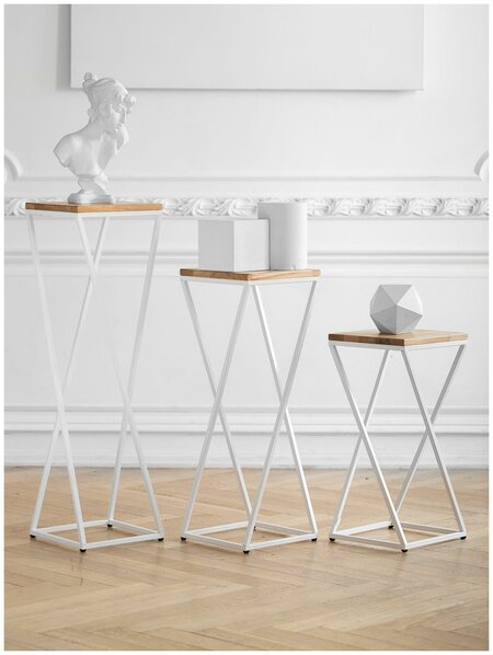 Столик-подставка под кашпо LOFT с белым основанием из стали подходит для различных интерьеров, будь то офис, салон красоты, дача, зал, квартира, кухня, гостиная или спальня. Хорошо будет смотреться в таких стилях, как минимализм, современный, лофт, арт-деко, сканди или хайтек. Интересные геометричные линии и натуральный дуб отлично впишутся в интерьер и станут его дополнением! Можно использовать как столик для кашпо с комнатным растением, прикроватный столик, столик под освещение или для любых других предметов. Столешница из дуба толщиной в 2 см покрыта износостойким лаком по дереву, которое увеличивает срок службы покрытия. Цельнометаллическая конструкция и порошковая окраска гарантируют устойчивость и долговечность конструкции. Имеются пластиковые регулировочные винты, которые позволят подставке устойчиво стоять на любой поверхности не царапая её. Высота столика 102 см, размеры столещницы 30х30 см. Поставляется в собранном виде. Характеристики: • размеры (длина х ширина х высота): 300х300х1020 мм, • материал столешницы: дуб, • высота подставки: 102 см, • материал каркаса – металл.