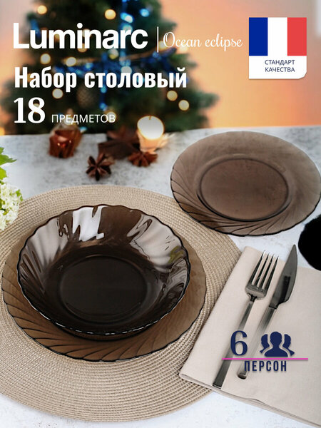 Столовый набор океан эклипс 18 предметов от LUMINARC - это высококачественный и стильный сервиз, который станет отличным подарком на любой праздник. Сервиз выполнен из стекла, что гарантирует его прочность и долговечность. Коричневый цвет придает набору элегантности и изысканности. В комплект входят 18 предметов: 6 десертных тарелок диаметром 19 см, 6 суповых тарелок диаметром 21 см и 6 обеденных тарелок диаметром 24,5 см. Сервиз можно использовать в микроволновой печи, что позволяет разогревать пищу прямо в тарелках. Набор подходит для мытья в посудомоечной машине, что значительно облегчает уход за ним. Произведенный в России, этот столовый набор океан эклипс 18 предметов от LUMINARC станет отличным выбором для тех, кто ценит качество, стиль и функциональность.