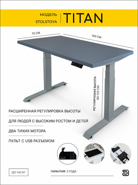 Рама для стола для работы стоя Титан серая и Столешница МДФ Сланцево-серая 140*70 см Стол TITAN от компании StolStoya по праву является флагманским в линейке рам для чередования работы стоя сидя StolStoya. Возможности этого стола во многом превосходит конкурентов. Модели, аналогичные TITANу от StolStoya стоят значительно дороже с меньшими возможностями. По функционалу данная модель превосходит большинство европейских моделей. Высота подъема стола 129 см, в отличии от основной массы аналогов, где этот показатель составляет только 120 см. Стол выдерживает нагрузку 140 кг - конкурентов 80-120 кг. Модель отличает простота сборки и жесткость конструкции. В комплект входят все крепежные элементы, ключи, шестигранники и т. д, поэтому для сборки Вам потребуется только шуруповерт. Такие столы позволяют одним нажатием кнопки на пульте управления или Вашем телефоне изменять высоту стола на трехступенчатых колоннах от 64 до 129 см в считанные секунды. Удобная, с качественным дизайном, панель управления монтируется в удобном для пользователя месте под столешницей. Панель управления показывает текущую высоту столешницы, поэтому автоматический стол можно регулировать под членов семьи и сотрудников. Встроенная память позволяет сохранить до 4-х различных положений стола для работы сидя и стоя. Кроме того модель управляется через мобильное приложение с Вашего телефона! Качественные столешницы без ЛДСП. Легкие (столешницы изготовлены по каркасной технологии). Отделка шпоном с покрытием итальянскими лаками (шпонированные столешницы) или крашеные столешницы, отделанные итальянскими лаками. С такими столешницами Ваш поднимающийся подъемный стол получит дополнительную индивидуальность и красоту. Особенности: Устойчивая конструкция. Легкая сборка Размер опоры 700*75 мм Размер боковой верхней опоры столешницы 570*46 мм Регулируемая ширина от 106 до 180 см Регулировка высоты от 64 до 129 см Подъемный вес - 140 кг Управление с пульта и мобильного приложения Пульт управления с возможностью сохранения 4-х положений столешницы Защита от перегрева Система защиты от столкновения Функция изменения параметров движения Защита от детей Функция чувствительности баланса Экран отображающий высоту столешницы Электронная система защиты от зажима с возможностью настройки чувствительности Цвет подстолья: Серебристый, черный, белый Питание: 120V/230 вольт Скорость подъема: 30 мм/с Нас также находят: Стол компьютерный, стол офисный, стол письменный, регулирующий высоту, подъемный стол, с подъемным механизмом, стол трансформер, стол для работы стоя