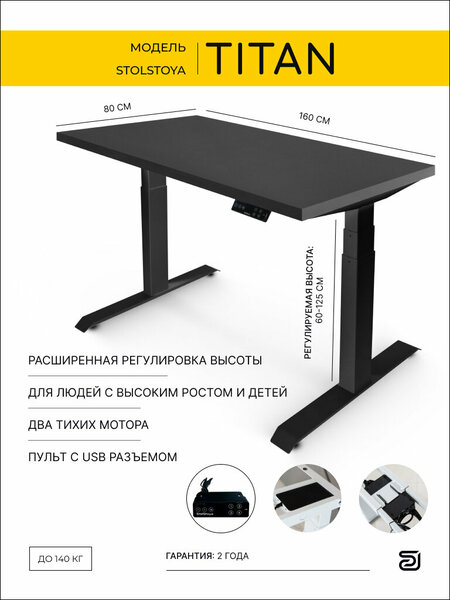 Рама для стола для работы стоя Титан черная и Столешница МДФ Черная 160*80 см Стол TITAN от компании StolStoya по праву является флагманским в линейке рам для чередования работы стоя сидя StolStoya. Возможности этого стола во многом превосходит конкурентов. Модели, аналогичные TITANу от StolStoya стоят значительно дороже с меньшими возможностями. По функционалу данная модель превосходит большинство европейских моделей. Высота подъема стола 129 см, в отличии от основной массы аналогов, где этот показатель составляет только 120 см. Стол выдерживает нагрузку 140 кг - конкурентов 80-120 кг. Модель отличает простота сборки и жесткость конструкции. В комплект входят все крепежные элементы, ключи, шестигранники и т. д, поэтому для сборки Вам потребуется только шуруповерт. Такие столы позволяют одним нажатием кнопки на пульте управления или Вашем телефоне изменять высоту стола на трехступенчатых колоннах от 64 до 129 см в считанные секунды. Удобная, с качественным дизайном, панель управления монтируется в удобном для пользователя месте под столешницей. Панель управления показывает текущую высоту столешницы, поэтому автоматический стол можно регулировать под членов семьи и сотрудников. Встроенная память позволяет сохранить до 4-х различных положений стола для работы сидя и стоя. Кроме того модель управляется через мобильное приложение с Вашего телефона! Качественные столешницы без ЛДСП. Легкие (столешницы изготовлены по каркасной технологии). Отделка шпоном с покрытием итальянскими лаками (шпонированные столешницы) или крашеные столешницы, отделанные итальянскими лаками. С такими столешницами Ваш поднимающийся подъемный стол получит дополнительную индивидуальность и красоту. Особенности: Устойчивая конструкция. Легкая сборка Размер опоры 700*75 мм Размер боковой верхней опоры столешницы 570*46 мм Регулируемая ширина от 106 до 180 см Регулировка высоты от 64 до 129 см Подъемный вес - 140 кг Управление с пульта и мобильного приложения Пульт управления с возможностью сохранения 4-х положений столешницы Защита от перегрева Система защиты от столкновения Функция изменения параметров движения Защита от детей Функция чувствительности баланса Экран отображающий высоту столешницы Электронная система защиты от зажима с возможностью настройки чувствительности Цвет подстолья: Серебристый, черный, белый Питание: 120V/230 вольт Скорость подъема: 30 мм/с Нас также находят: Стол компьютерный, стол офисный, стол письменный, регулирующий высоту, подъемный стол, с подъемным механизмом, стол трансформер, стол для работы стоя