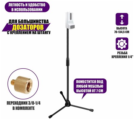 Стойка MLDZ-14 напольная мобильная для дозаторов - универсальная, предназначена для размещения дозаторов жидкого мыла и жидких дезинфицирующих (асептических) средств. Стойка изготовлена из прочного металла и имеет телескопическую конструкцию. Дизайн стойки создан с учетом максимальных требований к эргономике и внешнему виду. Ножки штатива помещаются под мебель высотой от 7 см от пола. Вы можете закрепить дозатор с помощью резьбы 1/4", если ваш дозатор имеет аналогичную резьбу или же насадить на стойку. Зависит от типа вашего дозатора. Мобильная стойка - это функциональное решение для помещений с высокой проходимостью таких как - больших офисных пространств, торговых центров, аэропортов, фитнес-залов, VIP-зон, ресторанов и любых других помещений. Установите стойку в любом месте с большим потоком людей, где необходима быстрая дезинфекция рук Особенности: - материал - металл; - удобные ножки; - регулировка высоты. Характеристики: - высота стойки - 70 - 134,5 см; - резьба стойки - 3/8" - резьба стойки с переходником - 1/4"; - длина каждой ножки - 29 см; - диаметр верхнего колена - 15 мм. Внимание: дозатор в комплект не входит! Гарантийный срок - 1 месяц В комплекте: - стойка ML - 1 шт. - переходник с резьбы 3/8 на 1/4 - 1 шт.