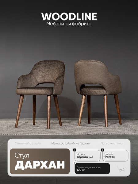 Стул Дархан — это сочетание надёжности и эстетики. Каркас выполнен из прочной фанеры, а ножки изготовлены из натуральной древесины твёрдых пород, таких как орех, дуб или ясень, что обеспечивает устойчивость и долговечность. Мягкое сиденье с плотным наполнением делает посадку особенно комфортной. Выдерживает нагрузку до 130 кг.
