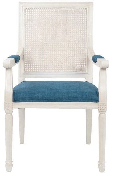 Стул Wilton White белого цвета создан в строгом дизайне на основе массива дуба и ротангового дерева. Для обивки использована приятная на ощупь льняная ткань. Квадратная спинка по периметру обрамлена деревянной рамкой, ножки украшены резьбой, на подлокотниках присутствуют мягкие накладки.