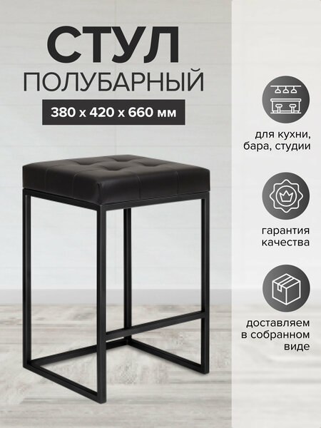 Полубарные стулья SOHO - современное решение для кухни, студии, салона. Надежное металлическое основание дополняет подушка из экокожи для комфортной посадки. Высота стула 66 см подходит для невысокой барной стойки. Металлическая мебель отличается долгим сроком службы, ее рекомендуют использовать для оснащения ресторанов и баров. Современные стулья дополнят интерьер квартиры, загородного дома, офиса, салона, ресторана и бара. Полубарные стулья популярны у дизайнеров для оформления пространств в стиле лофт, минимализм, хай-тек. Характеристики полубарного стула SOHO: • размеры (д х ш х в) 380х420х660 мм, • каркас - сталь с полимерным покрытием, • высота подушки - 80 мм, • обивка - экокожа, полиуретан 70%, хлопок 30%, плотность ткани - 307 г/кв. м, стойкость к истиранию 100 000 циклов, • наполнитель - пенополиуретан, • вес стула - 6,2 кг, • максимальная нагрузка - 100 кг. Каркас стула выполнен из профильной трубы 20х20 мм. Металлическое основание с матовым полимерным покрытием отличается повышенной прочностью, устойчивостью к царапинам. Для покрытия стали используется высококачественная порошковая краска. Современное производство GreenWeen гарантирует надежность и эстетику сварных швов металлической мебели. На ножках стула предусмотрены войлочные накладки для защиты напольного покрытия. Максимальная нагрузка на стул 100 кг. Обивка подушки выполнена из искусственной кожи с полиуретановым покрытием. Экокожа отличается хорошими гигиеническими свойствами, обеспечивает максимальный комфорт при использовании. Материал светостоек, воздухопроницаем, обладает высокой устойчивостью к многократному изгибу, к истираемости и царапинам. Рекомендации по уходу и чистке ткани: Очистка влажной мягкой тканью, после очистки обязательно протереть насухо. Не использовать для очистки влажные салфетки. Не использовать для чистки растворители и абразивные чистящие средства. Эффектное сочетание обивки из экокожи и металлического основания понравится всем ценителям стильной и надежной мебели. Качественные материалы позволят надолго сохранить первоначальный внешний вид. Коллекцию полубарных стульев дополняют стеллажи и консоль SOHO. Стулья доставляем в собранном виде в надежной упаковке.