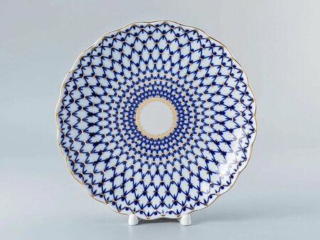 Сухарница рис. "Кобальтовая сетка" на форме "Тюльпан" изготовлена на Императорском фарфоровом заводе из твердого фарфора. Подходит для фруктов, печенья и конфет. Для декорирования используется подглазурная деколь, роспись золотом. Автор рисунка - Анна Яцкевич, автор формы - Серафима Яковлева. Выпуск изделия начался в 1951 году. Рисунок "Кобальтовая сетка" был создан в конце 1944 года художником Анной Яцкевич. В настоящее время "Кобальтовая сетка" является одним из самых популярных рисунков завода и "визитной карточкой" не только самого завода, но и Санкт-Петербурга. Диаметр изделия - 21.5 см, высота - 4,8 см, вес - 455 грамм.
