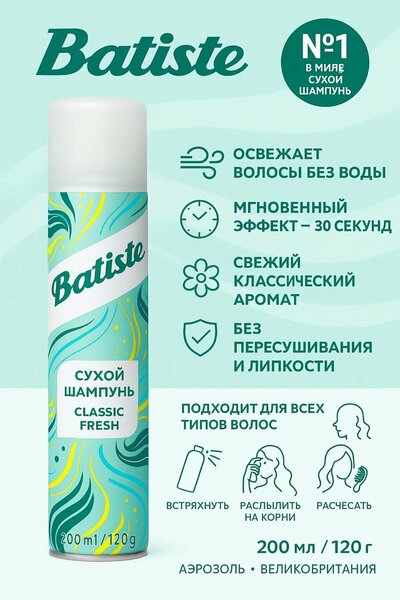 Сухой шампунь Batiste Original Classic Fresh, аэрозоль, для быстрого очищения без воды, 200 мл