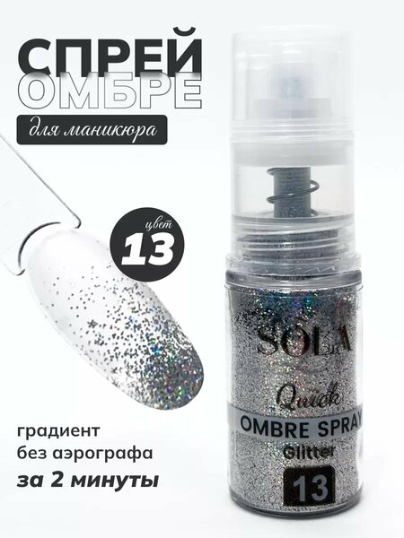 Спрей-омбре для маникюра Quick ombre dry glitter spray от Solalove это настоящая находка для мастера маникюра! Градиент блестками как аэрографом, только без аэрографа. Спрей станет достойной заменой аэрографа для маникюра. Создавайте омбре на ногтях лёгкими движениями руки. Данная коллекция отличается невероятной палитрой и эти блестки для ногтей не оставят вас равнодушными. Красивый дизайн ногтей в считанные минуты теперь это возможно! Инструкция по применению: 1. Перед началом работы с омбре-спреем, необходимо разработать дозатор. Для этого над салфеткой нажмите на кнопку спрея до упора примерно 6-8 раз. Высыпется обильное количество сухого пигмента, скопившееся в самом пульвелизаторе. Далее струя пигмента будет оптимальной для идеального градиента и можно приступать к дизайну! 2. На не просушенную в лампе базу/гель-лак, гель распылите спрей, начиная с кончика ногтя, постепенно двигаясь к кутикуле, снижая интенсивность нажатия и плотность цвета! 3. Перекройте топом (для идеального результата - сначала топом с л/с - затем глянцевым или матовым).