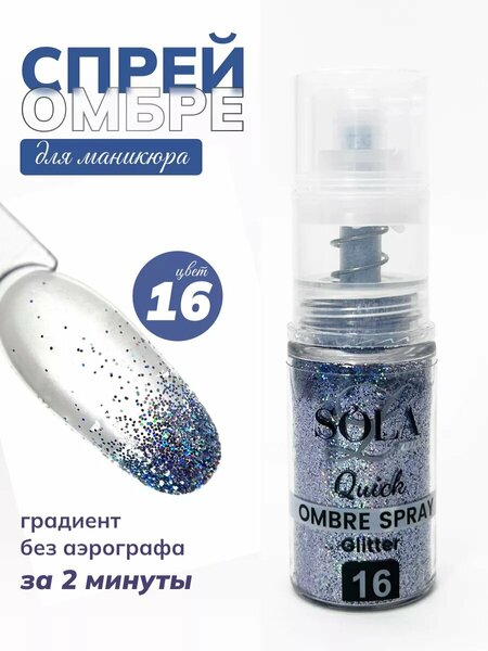 Спрей-омбре для маникюра Quick ombre dry glitter spray от Solalove это настоящая находка для мастера маникюра! Градиент блестками как аэрографом, только без аэрографа. Спрей станет достойной заменой аэрографа для маникюра. Создавайте омбре на ногтях лёгкими движениями руки. Данная коллекция отличается невероятной палитрой и эти блестки для ногтей не оставят вас равнодушными. Красивый дизайн ногтей в считанные минуты теперь это возможно! Инструкция по применению: 1. Перед началом работы с омбре-спреем, необходимо разработать дозатор. Для этого над салфеткой нажмите на кнопку спрея до упора примерно 6-8 раз. Высыпется обильное количество сухого пигмента, скопившееся в самом пульвелизаторе. Далее струя пигмента будет оптимальной для идеального градиента и можно приступать к дизайну! 2. На не просушенную в лампе базу/гель-лак, гель распылите спрей, начиная с кончика ногтя, постепенно двигаясь к кутикуле, снижая интенсивность нажатия и плотность цвета! 3. Перекройте топом (для идеального результата - сначала топом с л/с - затем глянцевым или матовым).