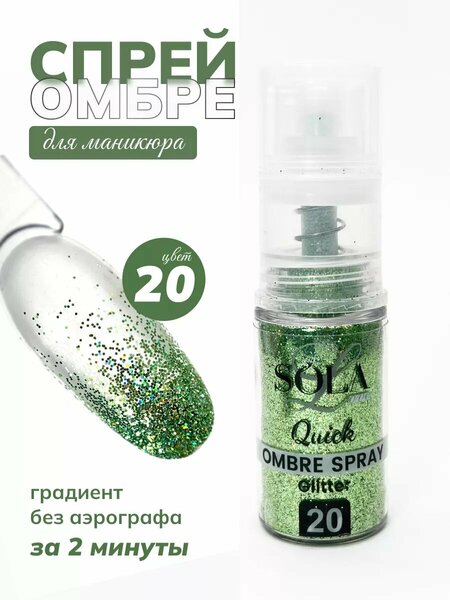 Спрей-омбре для маникюра Quick ombre dry glitter spray от Solalove это настоящая находка для мастера маникюра! Градиент блестками как аэрографом, только без аэрографа. Спрей станет достойной заменой аэрографа для маникюра. Создавайте омбре на ногтях лёгкими движениями руки. Данная коллекция отличается невероятной палитрой и эти блестки для ногтей не оставят вас равнодушными. Красивый дизайн ногтей в считанные минуты теперь это возможно! Инструкция по применению: 1. Перед началом работы с омбре-спреем, необходимо разработать дозатор. Для этого над салфеткой нажмите на кнопку спрея до упора примерно 6-8 раз. Высыпется обильное количество сухого пигмента, скопившееся в самом пульвелизаторе. Далее струя пигмента будет оптимальной для идеального градиента и можно приступать к дизайну! 2. На не просушенную в лампе базу/гель-лак, гель распылите спрей, начиная с кончика ногтя, постепенно двигаясь к кутикуле, снижая интенсивность нажатия и плотность цвета! 3. Перекройте топом (для идеального результата - сначала топом с л/с - затем глянцевым или матовым).