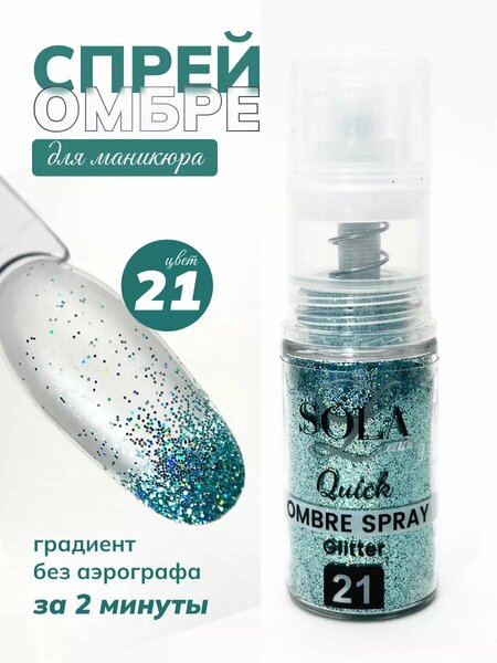 Спрей-омбре для маникюра Quick ombre dry glitter spray от Solalove это настоящая находка для мастера маникюра! Градиент блестками как аэрографом, только без аэрографа. Спрей станет достойной заменой аэрографа для маникюра. Создавайте омбре на ногтях лёгкими движениями руки. Данная коллекция отличается невероятной палитрой и эти блестки для ногтей не оставят вас равнодушными. Красивый дизайн ногтей в считанные минуты теперь это возможно! Инструкция по применению: 1. Перед началом работы с омбре-спреем, необходимо разработать дозатор. Для этого над салфеткой нажмите на кнопку спрея до упора примерно 6-8 раз. Высыпется обильное количество сухого пигмента, скопившееся в самом пульвелизаторе. Далее струя пигмента будет оптимальной для идеального градиента и можно приступать к дизайну! 2. На не просушенную в лампе базу/гель-лак, гель распылите спрей, начиная с кончика ногтя, постепенно двигаясь к кутикуле, снижая интенсивность нажатия и плотность цвета! 3. Перекройте топом (для идеального результата - сначала топом с л/с - затем глянцевым или матовым).