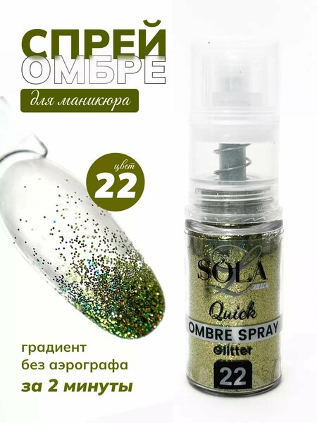 Спрей-омбре для маникюра Quick ombre dry glitter spray от Solalove это настоящая находка для мастера маникюра! Градиент блестками как аэрографом, только без аэрографа. Спрей станет достойной заменой аэрографа для маникюра. Создавайте омбре на ногтях лёгкими движениями руки. Данная коллекция отличается невероятной палитрой и эти блестки для ногтей не оставят вас равнодушными. Красивый дизайн ногтей в считанные минуты теперь это возможно! Инструкция по применению: 1. Перед началом работы с омбре-спреем, необходимо разработать дозатор. Для этого над салфеткой нажмите на кнопку спрея до упора примерно 6-8 раз. Высыпется обильное количество сухого пигмента, скопившееся в самом пульвелизаторе. Далее струя пигмента будет оптимальной для идеального градиента и можно приступать к дизайну! 2. На не просушенную в лампе базу/гель-лак, гель распылите спрей, начиная с кончика ногтя, постепенно двигаясь к кутикуле, снижая интенсивность нажатия и плотность цвета! 3. Перекройте топом (для идеального результата - сначала топом с л/с - затем глянцевым или матовым).