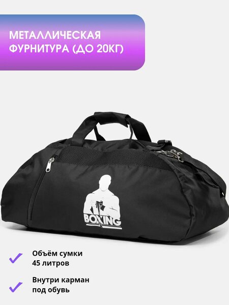 Вместительная мужская спортивная сумка, выполненная из водоотталкивающей ткани, объемом 45 литров, идеально подходит для тренировок и единоборств. Она вмещает всю необходимую экипировку, одежду и обувь для спортзала, а также вещи для поездок. Этот спортивный аксессуар легко превращается в рюкзак благодаря ремням, спрятанным в специальном кармане на молнии — идеальный вариант для туризма. Дно фитнес-сумки защищено дополнительным слоем уплотнителя, а сверхпрочная металлическая фурнитура выдерживает вес тренировочной экипировки до 20 кг, включая инвентарь для спортзала, бокса, борьбы. Эта спортивная сумка трансформер оснащена двумя ручками и регулируемым плечевым ремнем длиной 145 см на карабинах. Внутри один большой отсек, водонепроницаемый внутренний карман на молнии для обуви или мокрых вещей, а также два внешних кармана на молнии для мелочей и спортивных аксессуаров. Стильная и универсальная, с усиленной металлической фурнитурой подойдет как мужчинам, так и мальчикам-подросткам. Эта большая спортивная сумка изготовленная на собственном производстве в России, каждая проходит строгий контроль качества, чтобы вы получали надежный и долговечный продукт.