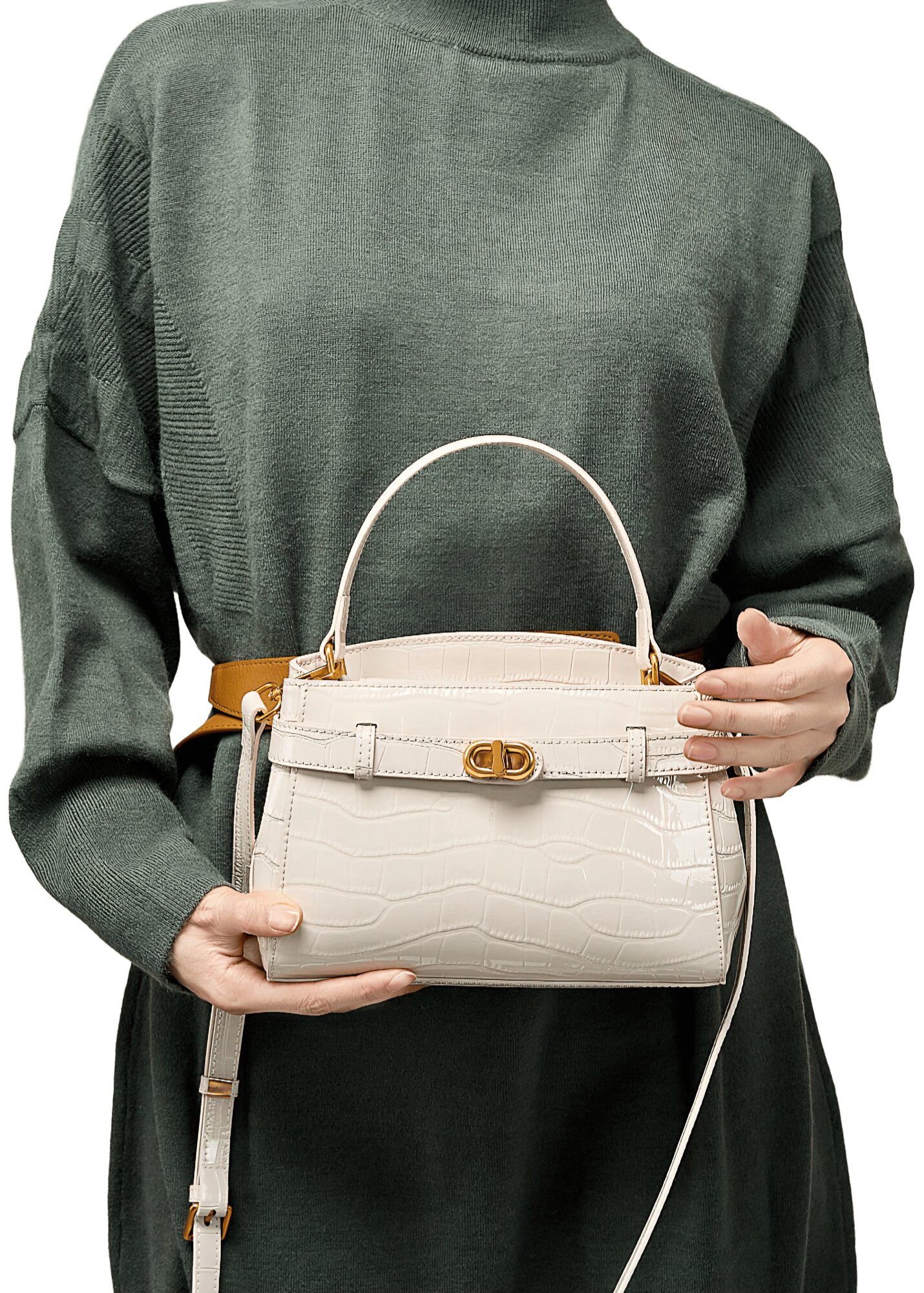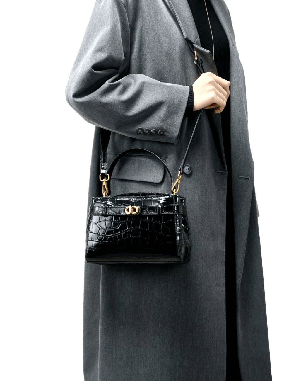 Эта элегантная сумка — воплощение роскоши и утончённого стиля. Основные характеристики: Материал: блестящая натуральная кожа с зеркальным блеском. Цвет: классический чёрный, относящийся к нейтральной цветовой группе. Универсальный оттенок, который гармонично сочетается с любым гардеробом. Фурнитура: золотистая. Форма: структурированная, округло-прямоугольная с чёткими линиями. Компактный и изысканный дизайн. Ручка: короткая, свёрнутая, удобна для ношения в руке. Застёжка: поворотная застёжка, обеспечивающая надёжное закрытие. Декоративные ремешки на передней части добавляют изысканности. Ножки: золотистые, защищают дно сумки от царапин и придают дополнительную элегантность. Дополнительные элементы: съёмный плечевой ремень позволяет носить сумку через плечо, делая её более универсальной. Особенности: Практичность: несмотря на компактные размеры, сумка вмещает все необходимые мелочи: телефон, кошелёк, помаду. Долговечность: высококачественные материалы и мастерство исполнения гарантируют долгий срок службы. Сочетается: с вечерними платьями для торжественных мероприятий; с классическими костюмами для деловых встреч; с элегантными пальто и тренчами для создания утончённого образа; с джинсами и блузкой для стильного повседневного лука. Эта сумка — не просто аксессуар, а символ статуса и безупречного вкуса, который подчеркнёт индивидуальность своей обладательницы.