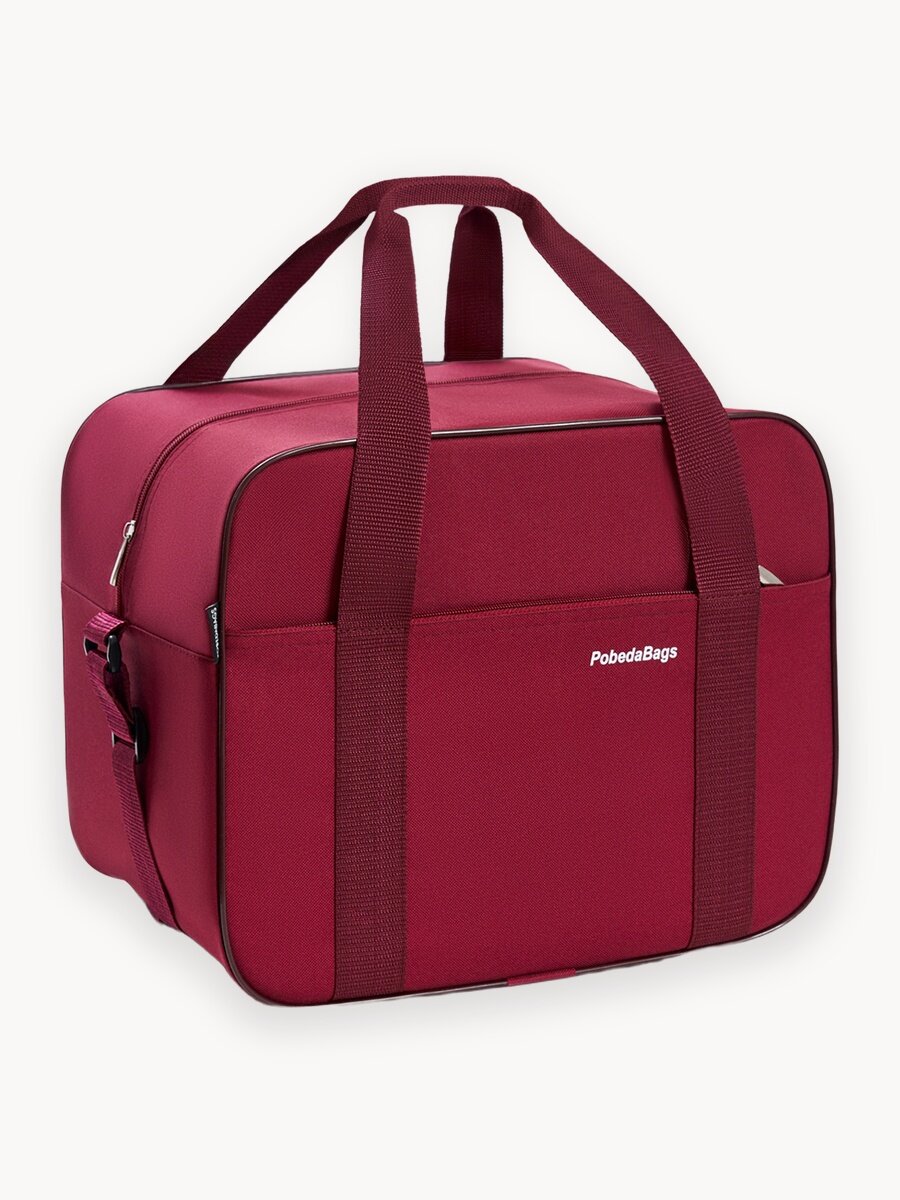 Дорожная сумка PobedaBags из серии "Стандарт" в вишнёвом цвете. Соответствует правилам провоза ручной клади авиакомпании "Победа" 36х30х27. Размеры на 0,5-1 см меньше габаритов калибратора 36 30 27 по каждому измерению для гарантированного прохождения проверки в аэропорту перед посадкой в самолёт. Грузоподъемность не менее 15 кг на боковых ручках, объем 26 литров. Сумка Победа ручная кладь прошита усиленными нитками, выполнена из прочного материала Oxford 600D Crystal, устойчивого к износу и непроницаемому для влаги. Модель не боится загрязнений, поскольку ткань прекрасно очищается. Сумку можно закрепить на чемодан, что особенно важно в длительных путешествих и поездках. Твёрдое дно отсутствует, но модель держит форму за счёт пластмассового канта. Плечевой ремень регулируется по длине до 135 см, закреплён на сумке прочной рамкой, не подверженной деформациям и устойчивой к перепадам температур. На рамке есть специальные засечки, предотвращающие перекручивание ремня. На лицевой части сумки есть карман для документов и предметов первой доступности. Внутренние швы обработаны отделочной лентой. Данная модель универсальна, удобна в переноске и эксплуатации, подходит и мужчинам, и женщинам. Компактно складывается, не занимая много места между перелётами. Саквояж будет отличным решением для похода на фитнес или в спортзал, прогулок, пикник, хранения вещей (например, швейной машинки), командировок или отдыха на пляже в отпуск.