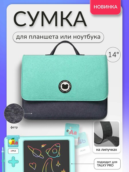 Фетровая сумка-клапан — удобный чехол для гаджетов и вещей. Эта сумка горизонтальной формы, как маленький рюкзак, но без лямок. Сделана из мягкого фетра, с одной ручкой — удобно держать даже маленькой ладошкой. Закрывается клапаном на липучку, вещи внутри в безопасности. Выдерживает до 5 кг . Внутрь помещается планшет TALKY и TALKY Pro или ноутбук до 15 дюймов. Размер сумки 25×35×8 см. Внутри одно большое отделение и два кармана для мелочей — развивающих карточек, ключей, зарядки, телефона. Лёгкая, компактная. Подходит для прогулок или поездок. Бери с собой — всё нужное всегда под рукой! Уход за изделием: Протирайте поверхность мягкой влажной тканью без абразивных средств. Не стирайте в машинке и не замачивайте в воде — фетр может деформироваться. Сушите на воздухе вдали от прямых солнечных лучей и обогревателей. Храните в сухом месте, избегайте длительного контакта с влагой. Периодически проветривайте и чистите внутри пылесосом с мягкой насадкой.