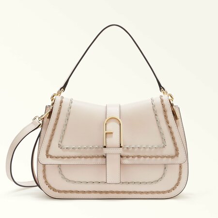 Универсальный, компактный и функциональный аксессуар Furla Flow обладает абсолютно современным характером. Он выполнен из телячьей кожи и завершен строчкой на краях для оригинального эффекта. Аксессуар выделяется декоративной застежкой с культовым логотипом, защищающим передний клапан. Сумку можно носить за верхнюю ручку, как кросс-боди или на плече. - Открытый внутренний накладной карман - Короткая верхняя ручка из гладкой кожи - Длинный съемный регулируемый плечевой ремень из гладкой кожи - Клапан с застежкой с магнитной кнопкой