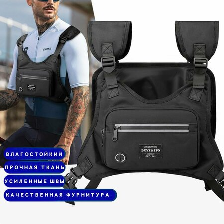 Стильная нагрудная сумка-жилет. Идеально для городских повседневных прогулок, путешествий, похода. Отличная альтернатива поясной сумки. Обеспечивает свободные руки, поэтому можно применять в качестве велосумки, для бега или для катания на самокате. Функциональные отделения позволят взять с собой самое необходимое: мобильник, документы, карточки, ключи, наушники. Изделие укомплектовано широкими ремнями-лямками, которые соединяются за спиной, они - с пластиковыми защелками, позволяющими быстро снять сумку. Сумка-жилет выполнен из прочного высококачественного полиэстера, обладающего водоотталкивающими свойствами и устойчивостью к механическим повреждениям