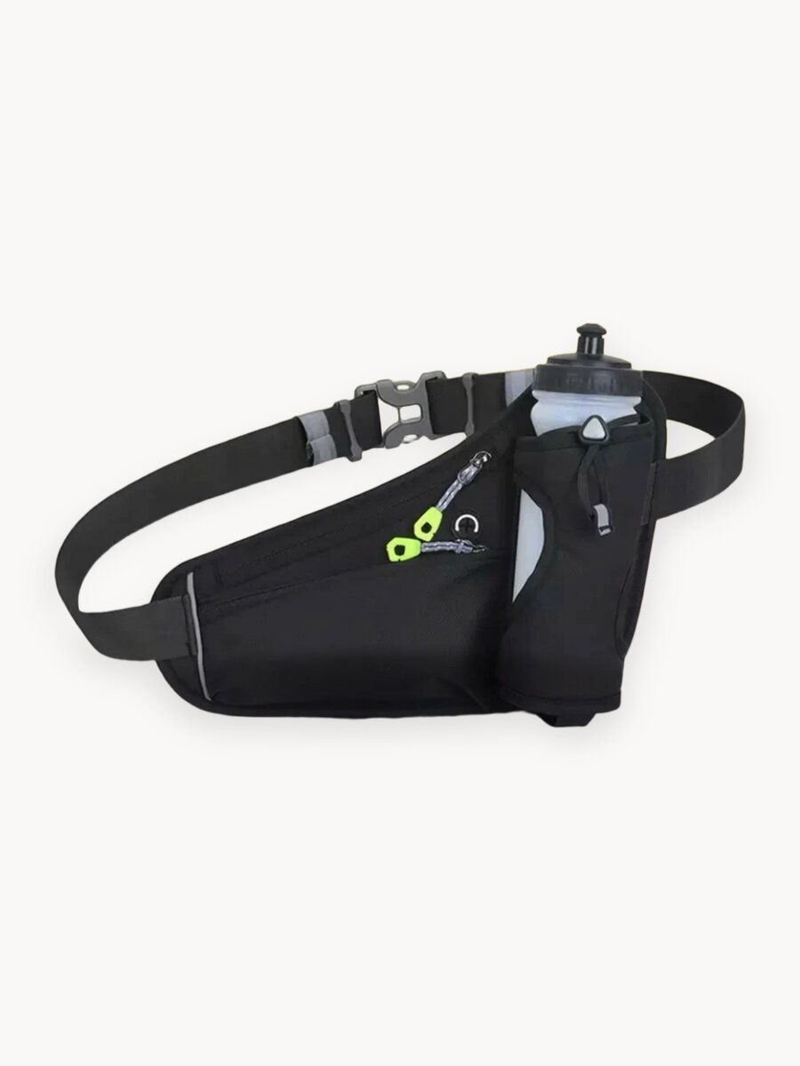 Спортивная сумка на пояс предназначена для хранения смартфонов, бутылки, гарнитуры, снэков и других мелочей во время занятия различными видами спорта. Пластиковая бутылка 600 мл идет в комплекте. Сумка выполнена из прочного синтетического волокна. Внешняя сторона сумки имеет водоотталкивающие свойства, внутренняя сторона имеет вентилируемую ткань в сеточку. 2 кармана для телефона и других мелочей закрываются на замок молния. Карман для бутылки глубокий и оснащен фиксирующим жгутом. При активном беге бутылка не выпадает. Бутылка выполнена из пищевого пластика. Ее следует тщательно промыть перед первым использованием.