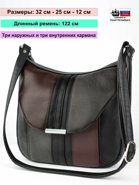 Эта женская сумка среднего размера: 31 см x 25 см x 11 см. Она выполнена из высококачественной искусственной кожи (экокожа). В сумке одно отделение с перегородкой, в которой расположен карман на молнии. Также внутри сумки два вместительных кармана один на молнии другой без молнии. На передней панели сумки два кармана на молниях. На задней панели сумки расположен карман на молнии. Сумка имеет длинный плечевой ремень с пряжкой, которая регулирует его длину. Сумку можно носить в руке или надев её на плечо. Сумка "Сильва" очень удобна в пользовании, по мнению покупателей, приславших нам отзывы. Она вместительна и не громоздка, держит форму при носке. Сумка достаточно легкая для своего размера.
