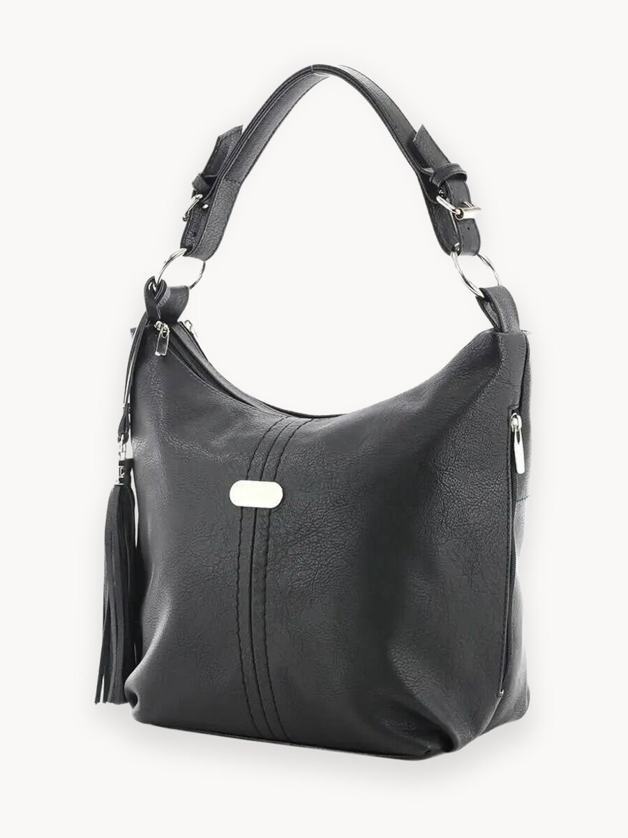 Женская сумка-тоут на плечо - стильный и практичный аксессуар для повседневной жизни. Изготовлена из качественной экокожи, устойчивой к воздействию высоких и низких температур, не трескается и не образует заломов. Фурнитура выполнена из металла и устойчива к коррозии, что гарантирует долгий срок службы. Сумка оснащена вместительным отделением, в котором можно носить документы и офисные бумаги формата А4, учебники и тетради для учебы в школе и университете. В двух внутренних боковых отделах с быстрым доступом удобно разместить гаджеты и другие вещи. Сумка-тоут представлена в красивой черной расцветке и оснащена плечевым ремнем, который можно носить через плечо или в руках. Защитные металлические ножки изделия уберегут покрытие дна от влаги и грязи. Вес товара составляет 600 г, высота ручек - 14 см, длина плечевого ремня - 130 см. Упаковка - пакет.