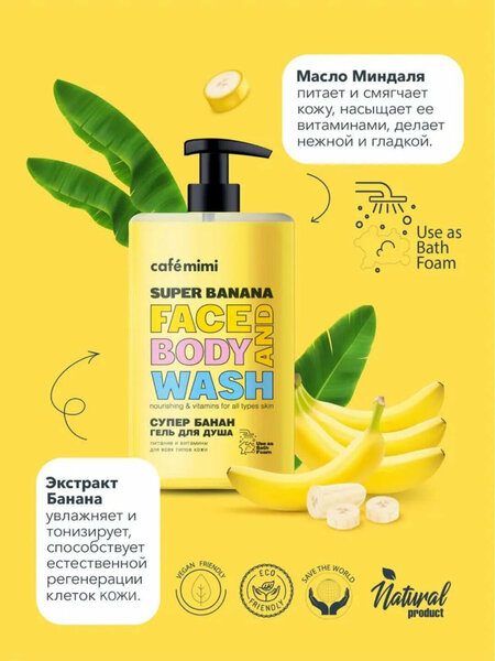 {"widgets":{"@card/UniversalPromoBadge":{"/content/page/fancyPage/defaultPage/universalPromoBadge":{"wrapperProps":{"margins":{"bottom":"3"}},"initialTime":1771209792474,"offerComposeId":"14968202693415649115"}}},"meta":{"/content/page/fancyPage/defaultPage/universalPromoBadge":{"name":"@card/UniversalPromoBadge"}},"collections":{"productServiceSnippets":{"14968202693415649115":{"productSnippet":{"snippetId":"document_id","type":"MODEL_CARD_LAYOUT","productPayload":{"snippetStyle":"NORMAL","title":{"value":"Гель для душа Cafe mimi \"Банан\", увлажняющий, для всех типов кожи, унисекс, 450мл"},"badges":{"gallery":[{"item":{"badgeType":"ORIGINAL","size":"S","style":"NORMAL","contentType":"TEXT","textPayload":{"text":"ОРИГИНАЛ"}},"type":"BADGE"}]},"price":{"actualPrice":{"amount":{"intPart":49000,"currency":"UZS"},"style":"RED","type":"OTHER_DISCOUNT"},"oldPrice":{"amount":{"intPart":199000,"currency":"UZS"},"style":"STRIKETHROWED"}},"gallery":{"mediaItems":[{"picture":{"baseUrl":"https://avatars.mds.yandex.net/get-mpic/7632591/2a0000019a913be016163eded988bbfe76a8/","width":1080,"height":1440,"title":"Гель для душа Cafe mimi \"Банан\", увлажняющий, для всех типов кожи, унисекс, 450мл"},"type":"IMAGE"}]},"wishlistButton":{"businessId":216515195,"mskuId":101393048902,"modelId":1401630757,"oskuId":4768891340,"offerId":"xLKxxA_w2hb9pmxTA3niRQ"}},"baobabPayload":{"type":"offer","wareId":"xLKxxA_w2hb9pmxTA3niRQ","modelId":1401630757,"marketSku":"101393048902","snippet_type":"product","isExpress":false,"price":199000,"additionalPrices":[{"priceType":"withDiscount","priceValue":49000},{"priceType":"unknown","priceValue":199000}],"hid":91176,"shopId":431782,"shopSku":"1966036","supplierId":216517133,"supplierType":3,"isUltima":false,"oskuId":4768891340,"snippetTheme":"GRID_FULL","stockCount":29,"promoLogJoinId":"711a2a69683fddeeb85d792fdcf8741a/8858cc7f900770d5"},"themeType":"GRID_FULL"}}}}}
