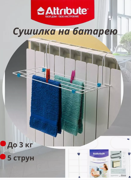 Сушилка мини торговой марки Attribute станет незаменимым помощником в Вашем доме. Компактная сушилка изготовлена из стали, покрытой влагоустойчивой белой эмалью. Сушилку легко подвесить на батарею или полотенцесушитель за специальные крепления. Она подходит для сушки мелких вещей, таких как носки, нижнее белье. Сушилка мини выдерживает максимальный вес белья до 3 кг, что примерно равно 1 циклу стиральной машины в режиме деликатной стирки. Контроль сварки и антикоррозийная обработка материалов обеспечивает долгий срок службы изделия. Габариты без упаковки, мм 525х220