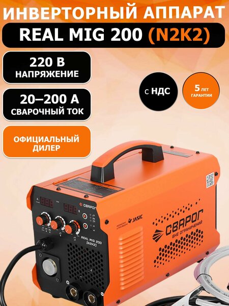 REAL MIG 200 (N2K2) — многофункциональный инверторный сварочный полуавтомат для полуавтоматической сварки в среде защитных газов (MIG/MAG), ручной дуговой сварки покрытыми электродами (MMA) и аргонодуговой сварки неплавящимся электродом (TIG Lift). Аппарат сочетает в себе широкие сварочные возможности, гибкие пользовательские настройки и высокую устойчивость к нестабильным условиям эксплуатации, что делает его отличным решением для профессионального применения и интенсивной работы. Отличительными особенностями аппарата являются