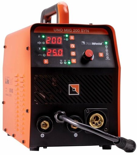 В сварочном полуавтоматическом аппарате FoxWeld UNO MIG 200 SYN реализовано много уникальных технологий и полезных для сварщика опций, позволяющих получить высокое качество сварного шва, даже специалистам с небольшим опытом работы. Помимо основополагающей функции полуавтоматической сварки проволокой в среде в среде защитных газов(CO2 и MIX(Ar + CO2)), реализованы режимы MMA (сварка покрытым электродом) и возможность работать вольфрамовыми электродами процессом TIG LIFT (контактный поджиг дуги). Сварочный инвертор реализован на современной IGBT транзисторной схеме. Аппарат может работать в электросетях с очень плохим качеством напряжения, в диапазоне от 150 до 270 Вольт. Особенности конструктива и корпуса блока питания: Корпус UNO MIG 200 SYN реализован в строгом профессиональном классическом стиле. На лицевой панели расположено два цифровых экрана, позволяющим точно настроить параметры сварки. С помощью плавной ручки регулировки и шести кнопок выставляются показатели работы. Кабели для ММА сварки подключаются через надёжные профессиональные байонеты 35-50. С помощью крепкой ручки, аппарат FoxWeld UNO MIG 200 SYN легко перемещать. Полярность сварки меняется на передней панели с помощью кабеля. Полуавтомат подключается при помощи электрической вилки к однофазной сети напряжением в 230 Вольт. Функции MIG/MAG процесса сварки: Возможно работать как проволокой в среде газа, так и порошковой проволокой; Можно использовать проволоку для сварки диаметрами 0,6/0,8/1 мм, при силе тока сварки от 30 до 200 Ампер; Регулировка индуктивности позволяет задать форму сварного шва; Функция Soft Start позволяет задать скорость подачи проволоки в начале сварочного процесса. Функции MMA процесса сварки: Возможность работать электродами диаметрами от 1,6 до 4,0 мм; Цифровой дисплей позволяет точно выставить ток сварки в диапазоне от 20 до 180 Ампер; Качественно реализованы основные вспомогательные опции: Антизалипание (Antisticking), Горячий старт (Hot Start), Форсаж дуги (Arc Force). Функции TIG LIFT процесса сварки: В UNO MIG 200 SYN реализован контактный способ поджига дуги вольфрамовыми электродами; Работать можно неплавящимися электродами диаметром от 1 до 2,4 мм; Чтобы использовать заложенную опцию TIG LIFT, нужно дополнительно купить горелку и расходные компоненты для TIG сварки, в стандартном комплекте поставки нет элементов для TIG LIFT сварки. Особенности источника питания полуавтоматической сварки FoxWeld UNO MIG 200 SYN: Параметры формы сварного шва можно задать настройкой индуктивности аппарата; Полноценное синергетическое управление процессами сварки позволяет работать даже с тонкостенным металлом; Возможность ручной подстройки системы управления аппаратом. Реализация основного функционала: Двух роликовый металлический механизм подачи проволоки; Настройка скорости подачи проволоки: от 1,5 до 12 метров в минуту; Большой диаметр штока гарантирует надёжное крепления катушки проволоки; Возможность работать с диаметрами D100 и D200. Характеристики: