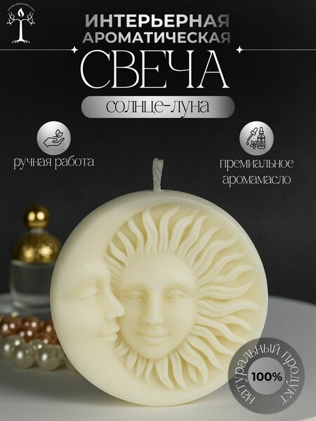 Свеча ароматическая Солнце-луна 100% натуральный соевый воск (без добавления стеарина, парафина и пр.) + натуральное ароматическое масло премиального качества + хлопковый фитиль. Высота: 6 см. Толщина: 3 см." Каждый видит в пламени свечи что-то свое. Ароматические свечи помимо смыслов наполняют ароматами. Наши свечи натуральные, высококачественные, красивые и ароматные. Мы вкладываем в процесс свечеварения свою душу и хотим поделиться ее частичкой с вами, чтобы вы нашли в огне свечи то, что будет вас наполнять и зажигать. Потому что внутри вас точно горит огонь! Предлагаем вам премиальные ароматические свечи ручной работы из лучших материалов: натуральные, высококачественные, красивые и ароматные. Свечи изготовлены из натурального безопасного соевого воска с добавлением ароматического масла класса "люкс". Свечи Tema Fire подойдут для любых целей: - украшение интерьера; - подарок для самых близких и любимых; - создание настроения и уюта; - стильное оформление релакс-зоны; - ароматерапия; - оформление праздника; - создание романтической атмосферы; - отличный реквизит для тематических фотосессий. Наши свечи доставляются в подарочной упаковке.