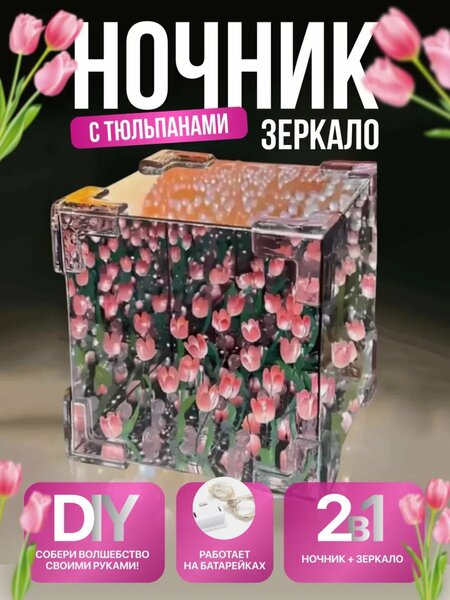 Оригинальный подарок девочке своими руками. Ночник с бесконечными тюльпанами - это символ нежности и любви. Этот ночник с тюльпанами создан для тех, кто ищет уникальный декоративный элемент для своего интерьера. Набор "собери сам" позволяет превратить его в увлекательное творчество. Светильник выполнен в форме куба и предназначен для использования внутри помещений. Внутри куба нежно расположены миниатюрные тюльпаны, создающие атмосферу вечной весны вокруг. Светильник с цветами в форме куба очень функционален, он послужит вам днем в качестве зеркала, а ночью – ночника. Он идеально подходит для создания в комнате мягкого света, подойдет для детской спальни. Свечение теплого света через тюльпаны создаст волшебную и романтичную атмосферу в вашей комнате. Ночник с цветами добавит изысканности и уюта вашему дому. Светодиодная лампа в виде цветка добавляет изюминку вашему подарку. Светильник с тюльпанами в форме куба – это не просто предмет декора для комнаты и гостиной, но и отличный подарок для любимого человека. Вы можете порадовать этим подарком своих детей, ведь это прекрасный подарок для дочки. Ночник с цветами внутри куба стал очень популярным и завирусившимся подарком, который не оставит равнодушным никого. Ночник зеркало так же станет отличным подарком на выпускной и последний звонок для девочек.