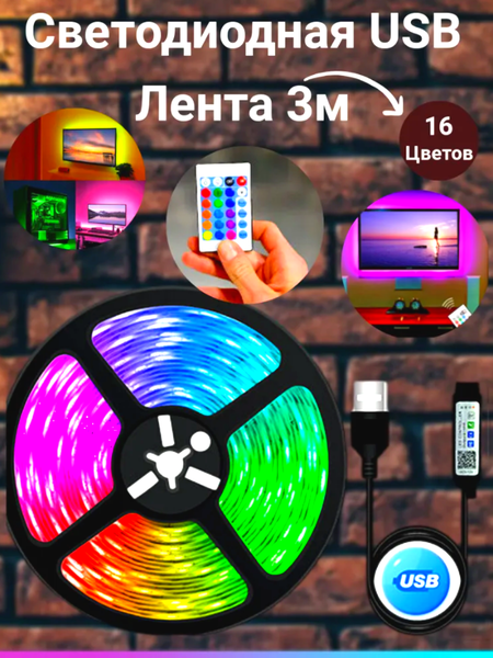 Уникальный комплект светодиодной ленты 3 метра RGB. Лента USB 5050 60Led, DC5V Может использоваться абсолютно с любыми устройствами через USB, также может использоваться с зарядным устройством/адаптером для вашего телефона (5V). Задняя поверхность самоклеящаяся с двусторонней клейкой лентой. **Данный набор включает в себя: Мини-контроллер с полноценным пультом + светодиодная лента RGB, USB, 5050 Вы можете самостоятельно настроить яркость, устанавливать и изменять цвета, менять режимы работы ленты с помощью пульта дистанционного управления. Светодиодная лента 3м. подходит для кухни, ванной, коридора, гостиной, прихожей, спальни и конечного же идеально подходит для телевизора, чаще всего наклеивают на заднюю стенку телевизора для создания эффекта типа Ambilight. Светодиодная лента многоцветная подключается через USB. Пуль ДУ идет в комплекте. Диодная лента имеет 16 цветов и имеет влагостойкость IP65. Светодиодная лента RGB подойдет для создания декоративной подсветки, для оформления праздничных мероприятий и пр. Лента светодиодная работает от напряжения 12В постоянного тока, питается от usb-порта. В комплекте преобразователь питания с USB. Простая установка: - Просто обрежьте ленту до желаемой длины. - Удалите клейкую подложку на ленте. - Плотно приклейте ленту в нужном месте и подключите USB к usb-порту. Возможные варианты применения ленты: Подсветка фона телевизора, подсветка фона монитора компьютера, подсветка системного блока, подсветка в автомобиле, электросамоката или велосипеда, подсветка портативной блютуз колонки, и др.