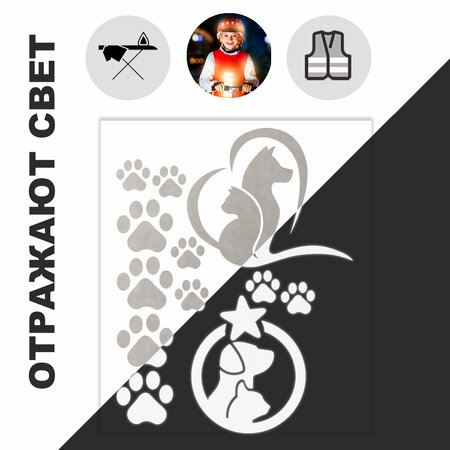 Светоотражающие наклейки на одежду Self Line с питомцами: котиками, собачками и лапами. Имеют высокий коэффициаент светоотражения. Помогут Вас защитить на дороге. Могут использоваться в качестве латки на одужду. В наборе 12 наклеек: 1 (собака и кот со звездой) - 54х65 мм, 1 (собака и кошка в сердце) - 77х57мм, 4 лапы 26х25мм, 6 лап - 15х16мм. Аппликация на ткани, нанесённая с помощью данного термотрансфера, отражает свет и красиво переливается. Сделает Вас заметнее для автомобилей и окружающих. Вы можете нанести данную термоапликацию на верхнюю одежду, рюкзак, футболку, кепки и любой другой текстиль. Всё что Вам необходимо, это отрезать необходимое изображение. Затем положить его на изделие глянцевой стороной вверх. Накрыть сверху защитной тканью или марлей. Прогладить с помощью утюга на 150-160 градусах (2 режим, шерсть) в течение 15 секунд. Дать остыть и снять глянцевую защитную плёнку. Обратите внимание, данные термоапликации можно нанести практически на любые ткани, кроме тканей с водооталкивающей пропиткой/покрытием. Выдерживают многократные стирки. При температуре ниже 0 теряют эластичность.
