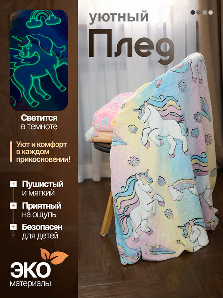 Светящийся плед в темноте, велсофт, мягкий , размер 150x180, единорог