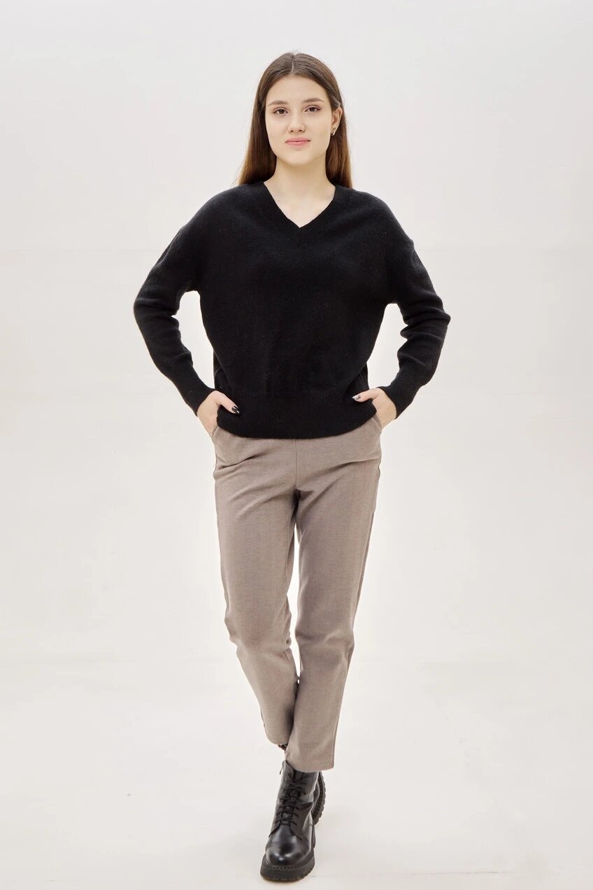 Расслабленный свитер свободного кроя с глубоким V-образным вырезом и спущенной линией плеча. Выполнен из приятного к телу трикотажа гладкой вязки и дополнен широкой резинкой в рубчик в зоне манжет, горловины и нижнего края.
