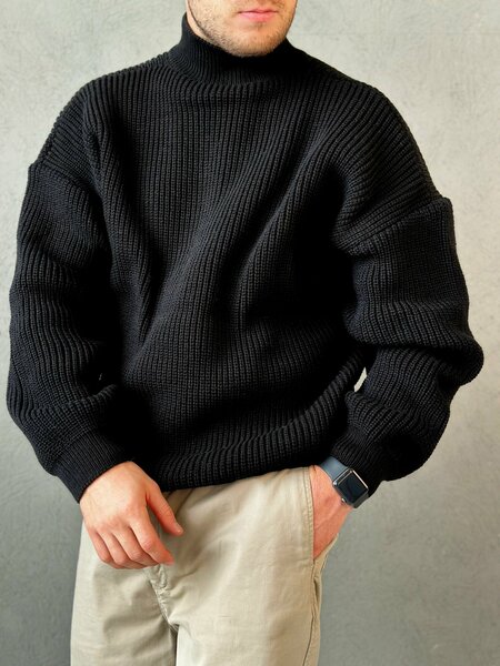 Свитер мужской с воротником стойкой, крупной вязки, черного цвета-это база в мужском гардеробе. Подойдет для деловых и повседневных образов. Свитер на осень с горлом для мужчин выполнен из вязаного трикотажа: в нём будет уютно и тепло в прохладную погоду. Благодаря фактурной вязке джемпер хорошо тянется, держит форму, выгодно выделяя среди других. Мужская кофта из натуральной шерсти с акрилом прекрасно сохраняет тепло, она очень прочная, не растягивается и не мнется. В ней комфортно зимой и осенью. Воротник стойка не пережимает горло и держит форму. Свитер прекрасно освежит ваш весенний гардероб.