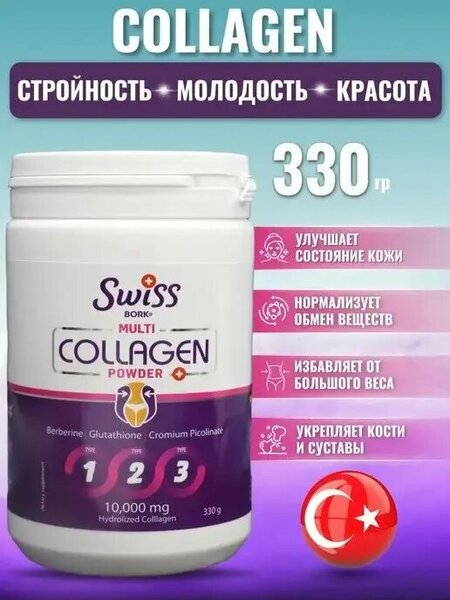 Укрепляет кости Заботится о волосах, ногтях, коже и лице Swiss Bork Multi Collagen — это коллагеновый порошок, разработанный для поддержания красоты и здоровья. Способствует здоровью кожи, волос, ногтей, суставов и костей Омолаживает кожу и повышает её эластичность Разглаживает мелкие морщины Предотвращает выпадение волос Укрепляет ногти Поддерживает кровеносную систему Регулирует обмен веществ Укрепляет кости и суставы Восстанавливает хрящи Улучшает пищеварение