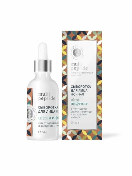 Сыворотка для лица ночная ультралифтинг Идеальный помощник в борьбе с увяданием и сухостью кожи. Активные компоненты сыворотки улучшают состояние кожи, препятствуют ее преждевременному старению. Пептиды (микропротеины) шелка и пшеницы в сочетании с коллагеном глубоко увлажняют и смягчают, придают коже упругость, укрепляют ее антиоксидантную защиту. Экстракт имбиря обладает эффектом лифтинга, стимулирует регенерацию клеток, слегка матирует. Состав: вода подготовленная, экстракты ромашки, имбиря, пантенол, микропротеины шелка и пшеницы, коллаген, пирролидонкарбонат натрия, гиалуроновая кислота высокомолекулярная, аллантоин, кислота лимонная, гиалуроновая кислота низкомолекулярная, этилгексилглицерин, бензиловый спирт, дегидроуксусная кислота, сорбиновая кислота, бензойная кислота, парфюмерная композиция. Способ применения: за час до сна нанести на сухую чистую кожу лица. После впитывания для усиления эффекта рекомендуем нанести ночной крем из этой линейки.
